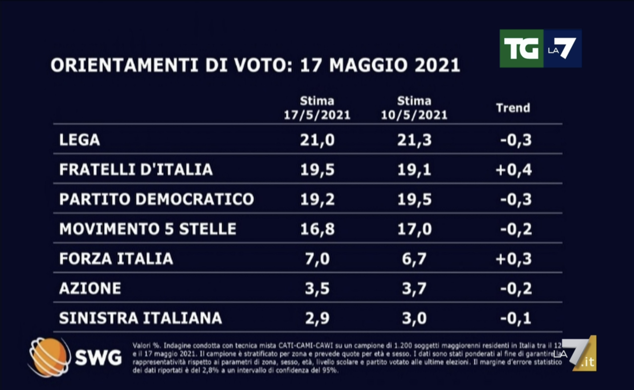 Secondo la rilevazione dell’istituto, il partito di Matteo Salvini rimane il primo partito, ma cala ancora nei consensi. Il Carroccio, infatti, perde lo 0,3 per cento e scende dal 21,3% della settimana scorsa al 21 per cento di questa settimana.