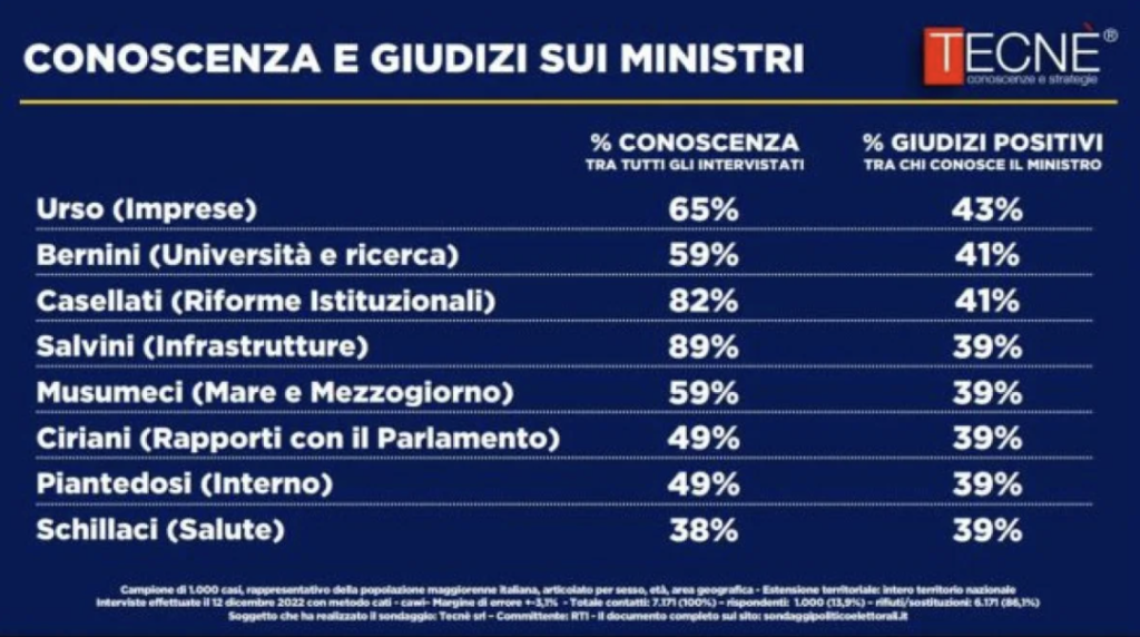 Sondaggi politici elettorali oggi 19 dicembre 2022: Tajani il ministro più gradito del governo Meloni, Salvini fuori dai primi dieci