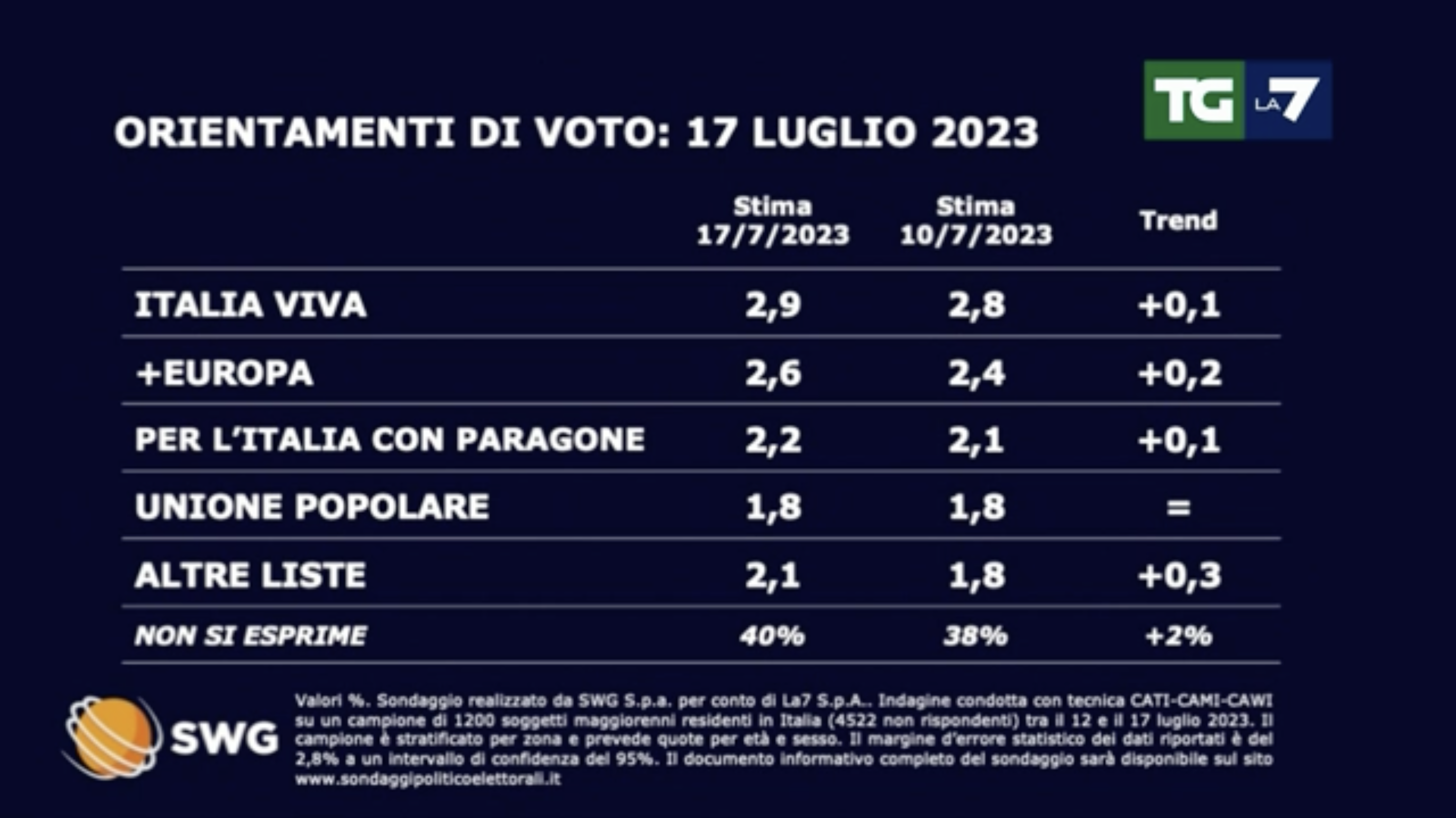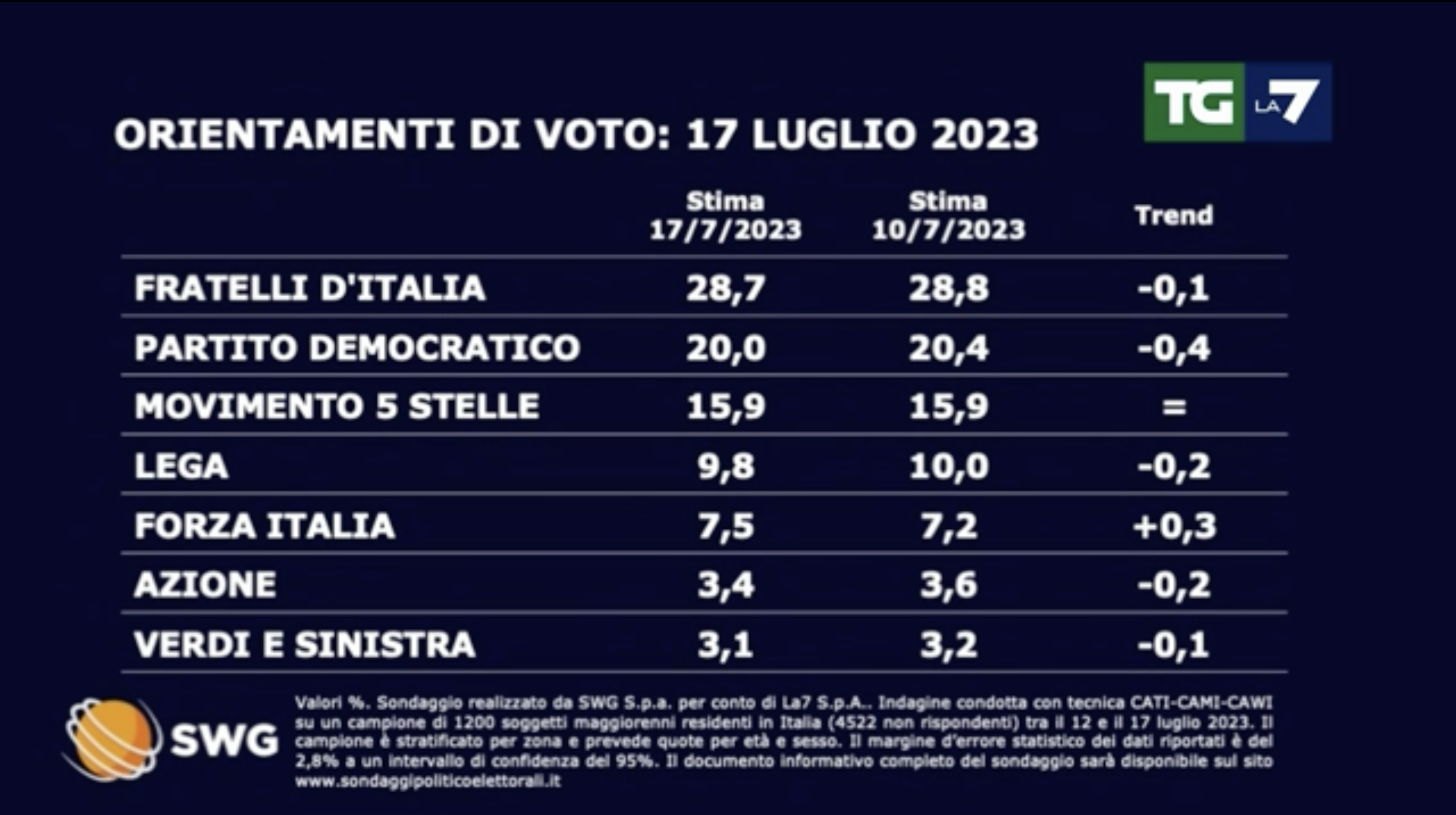 Sondaggi politici elettorali oggi 19 luglio 2023