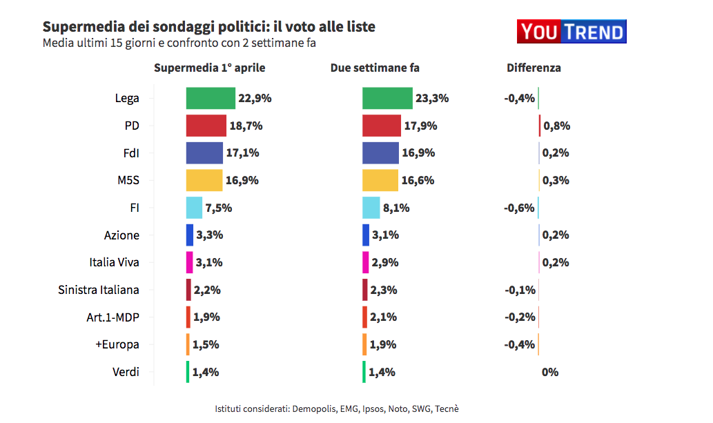 SONDAGGI POLITICI ELETTORALI OGGI – La Lega di Matteo Salvini scende sotto il 23 per cento per la prima volta in quasi 3 anni, portandosi al 22,9 per cento (era al 23,3 per cento due settimane fa). È quanto emerge dalla Supermedia dei sondaggi realizzata da Youtrend prendendo in esame le rilevazioni dei principali istituti condotte nell’ultima settimana.