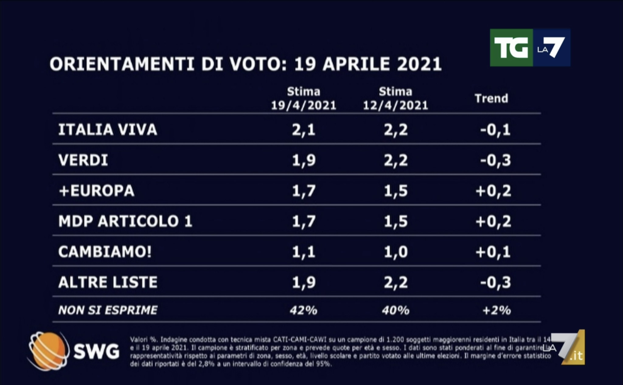 Sinistra Italiana scende al 2,8%, perdendo lo 0,2 per cento, mentre Italia Viva cala al 2,1 per cento. Sale al 42%, invece, la stima di coloro che non si esprimono.