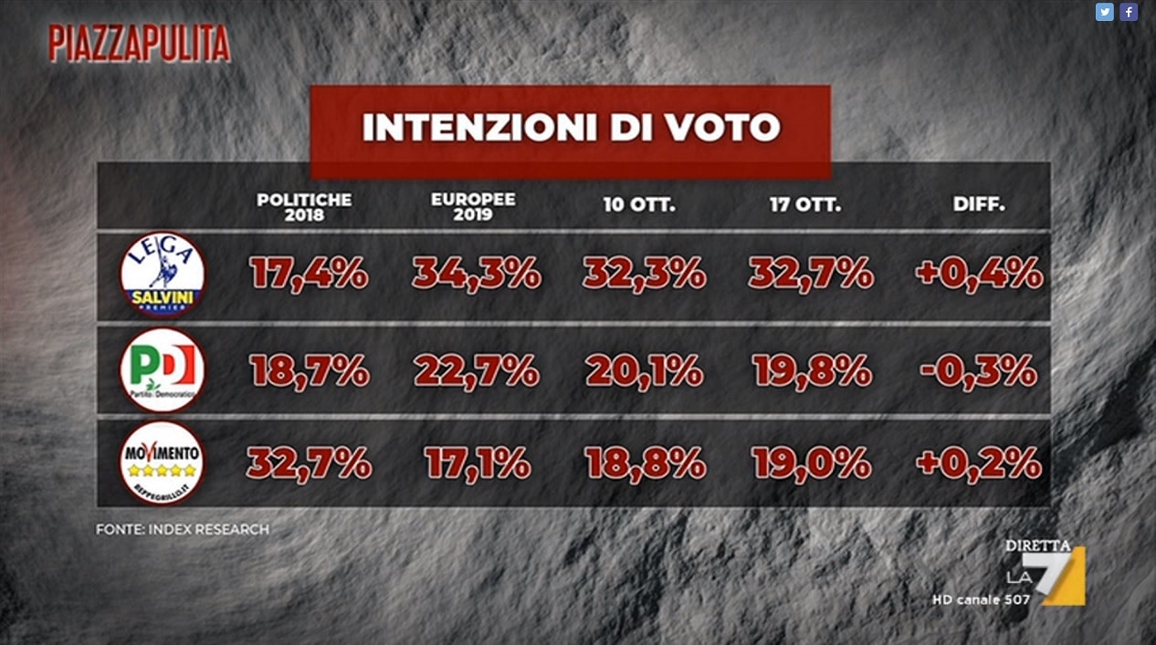 Il sondaggio realizzato da Index Research nei giorni scorsi e diffuso giovedì 17 ottobre nel corso del programma di La7 Piazzapulita attribuisce alla Lega il 32,7 per cento del consenso, in crescita dal 32,3 della precedente rilevazione dello stesso autore, effettuata una settimana prima. Il Partito Democratico intanto sarebbe sceso dal 20,1 al 19,8 per cento e il Movimento 5 Stelle salito dal 18,8 al 19,0.