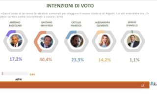 A oggi, nelle intenzioni di voto, le preferenze dei napoletani sono queste: Gaetano Manfredi candidato del centrosinistra e del M5S al 40,4 per cento. Segue Catello Maresca civico appoggiato dal centrodestra con il 23,3, Antonio Bassolino indipendente 17,2, Alessandra Clemente in quota demA con il 14,2. Outsider Sergio D’Angelo, civico all’1,1. Ma si vota tra 120 giorni e la partita è apertissima per tutti.