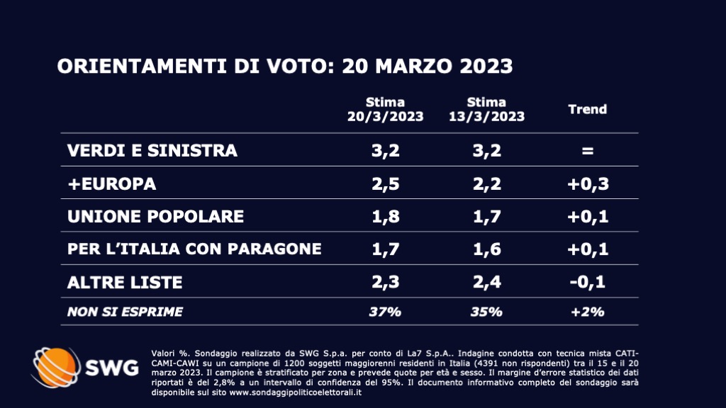 Ancora in calo il Movimento 5 stelle che perde 0,8 punti scendendo così al 15,3 percento. In discesa anche la Lega, arrivata all’8,5 percento dopo un calo di 0,3 punti. Accorcia le distanza Azione/Italia viva, che si attesta al 7,7 percento (+0,2%), mentre Forza Italia scende al 6,3 percento (-0,1%). Stabile l’Alleanza Verdi/Sinistra italiana al 3,2 percento mentre guadagna 0,3 punti +Europa, ora al 2,5 percento. Seguono Unione popolare all’1,8 percento e la lista “Per l’Italia con Paragone” all’1,7 percento.