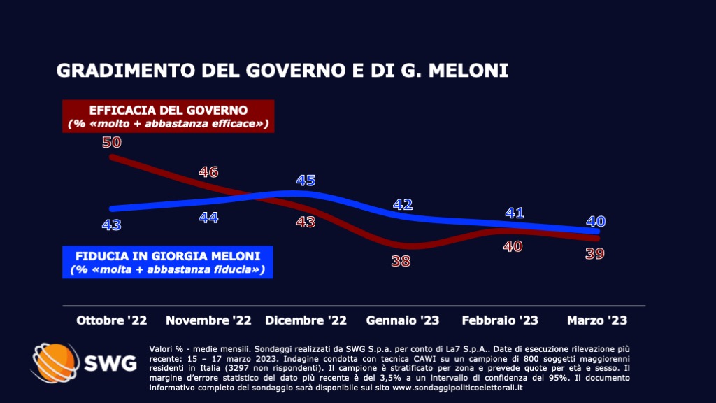 Ancora in calo la fiducia in Giorgia Meloni: dai massimi di dicembre, quando la quota di chi diceva di avere “molta” o “abbastanza” fiducia nella presidente del Consiglio era pari al 45 percento, oggi l’indice è sceso al 40 percento. Scende anche la percezione dell’efficacia del governo. Solo il 39 percento giudica il governo “molto” o “abbastanza” efficace, rispetto al 50 percento di ottobre.