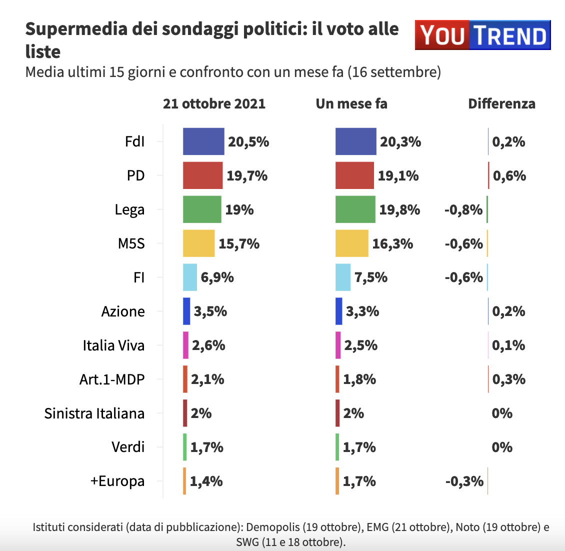 Sondaggi politici elettorali oggi 22 ottobre 2021: Il Pd supera la Lega e insegue Fratelli d’Italia. Calano M5S e Forza Italia