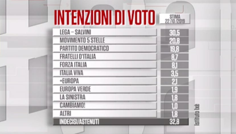 Qui riportiamo alcuni dati sulle intenzioni di voto ai partiti aggiornati ad oggi, mercoledì 23 ottobre 2019.