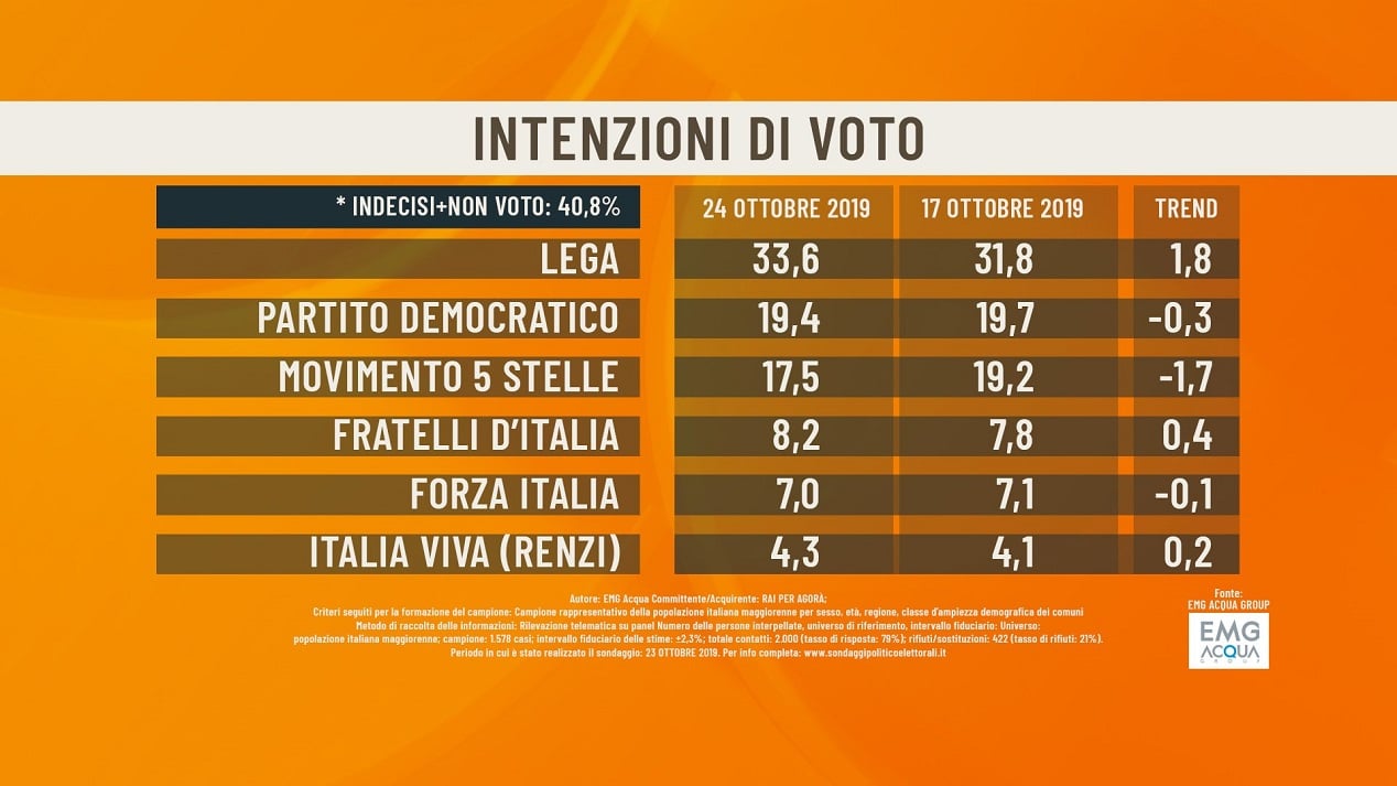 Il sondaggio realizzato da Emg e diffuso ieri, giovedì 24 ottobre, nel corso del programma di Raitre Agorà segnala la Lega al 33,6 per cento di preferenze potenziali, in salita di quasi due punti dal 31,8 che lo stesso autore aveva rilevato una settimana prima. Ma a crescere è tutto il centrodestra nel suo complesso.