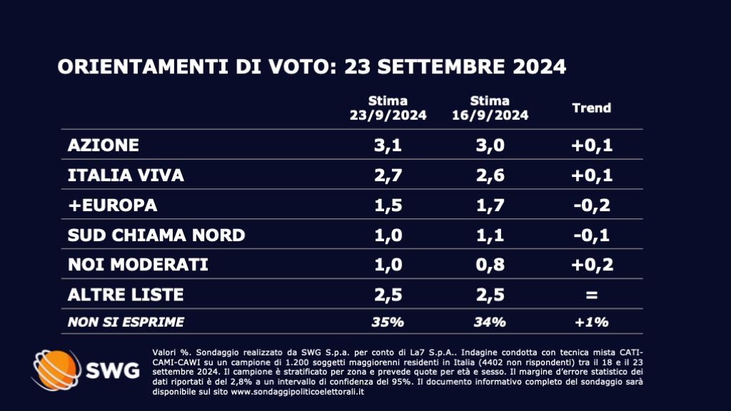 In crescita dello 0,1% Verdi/Sinistra Italiana, che raggiunge così il 7,1 per cento, così come Azione e Italia Viva. Il partito di Carlo Calenda sale al 3,1 per cento, mentre quello guidato dall’ex presidente del Consiglio Matteo Renzi arriva al 2,7%.