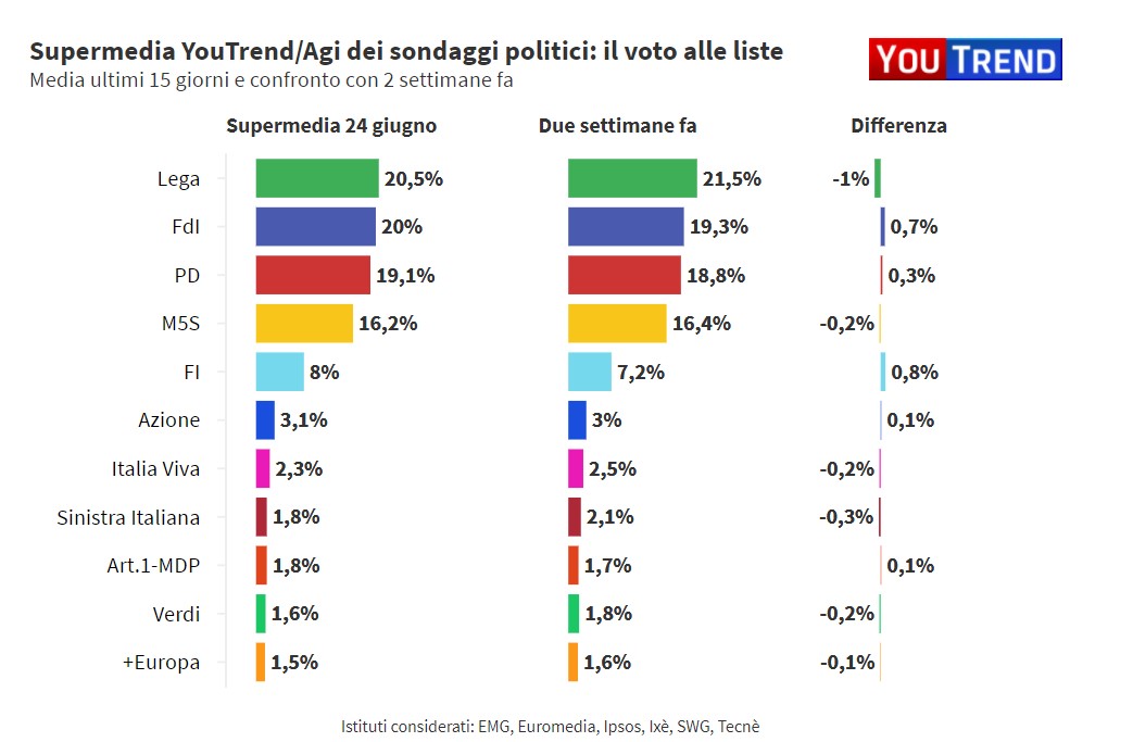 SONDAGGI POLITICI ELETTORALI OGGI – Mai così vicini. Lega e Fratelli d’Italia sono a solo mezzo punto di distanza. Un gap ormai ridottissimo, dovuto al continuo calo di consensi da parte del Carroccio e alla contestuale ascesa di Fratelli d’Italia. A rivelarlo è la Supermedia YouTrend per Agi aggiornata al 24 giugno, che analizza come di consueto la media dei principali sondaggi nelle ultime due settimane. La Lega è ora data al 20,5%, mentre il partito di Giorgia Meloni sale al 20%. Il divario si è dunque ridotto ormai allo 0,5. Rispetto all’ultima rilevazione, il Carroccio ha perso l’1%, mentre FdI è salita dello 0,7%.