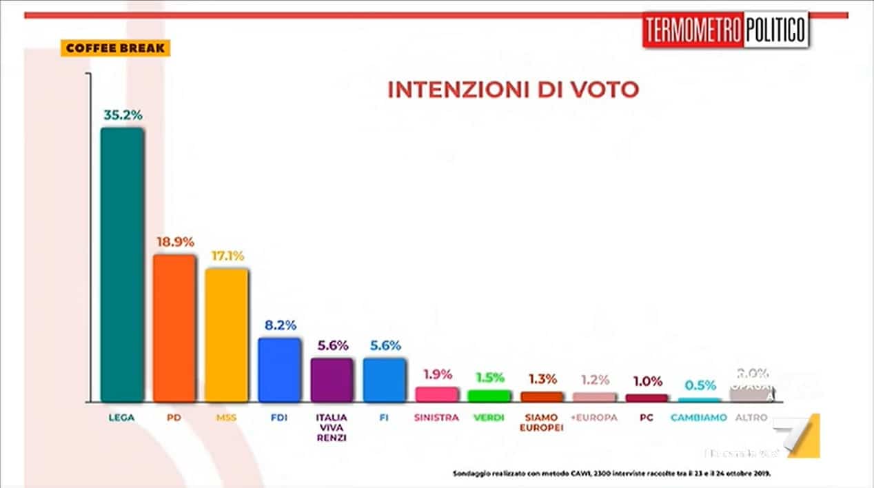 Stando alla rilevazione diffusa venerdì 25 nel corso del programma di La7 Coffee Break, con interviste del 23 e 24 ottobre, la Lega sarebbe oggi al 35,2 per cento di consenso contro il 34,3 raccolto con le elezioni europee di cinque mesi fa, mentre il Partito Democratico non va oltre il 18, 9 per cento.