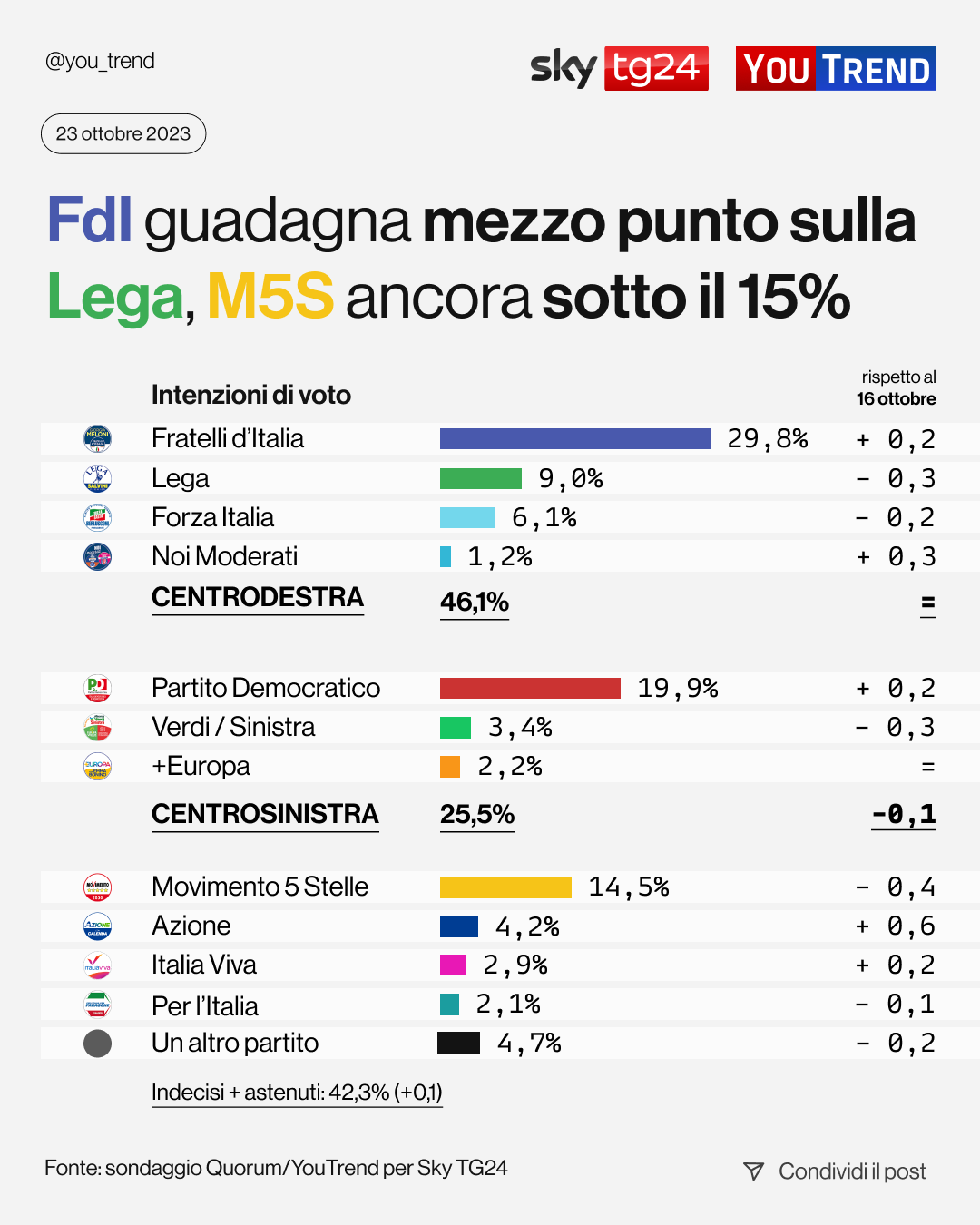 Secondo la rilevazione, Fratelli d’Italia guadagna lo 0,2% e si porta a un passo dal 30 per cento (29,8%). Lega e Forza Italia calano rispettivamente dello 0,3 e dello 0,2 per cento e ora sono rispettivamente al 9 e 6,1%. A compensare il calo, però, è la crescita, oltre che di Fdi, di Noi Moderati che sale all’1,2 per cento. Il centrodestra, infatti, resta stabile al 46,1%.