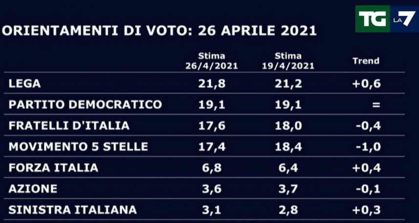 L’ultimo sondaggio di Swg ha registrato gli orientamenti di voto al 26 aprile 2021. Rispetto alla settimana precedente la Lega ha guadagnato lo 0,6 per cento, portandosi al 21,8 e riavvicinandosi a quota 22, dopo aver registrato le percentuali più basse degli ultimi tre anni, da quando cioè risulta il primo partito nei sondaggi: la settimana scorsa il partito di Salvini aveva perso quasi un punto in sette giorni. Una debacle che ha in parte motivato il pressing di Salvini sul coprifuoco, e dunque l’astensione all’interno dell’ultimo Consiglio dei ministri sul decreto riaperture.