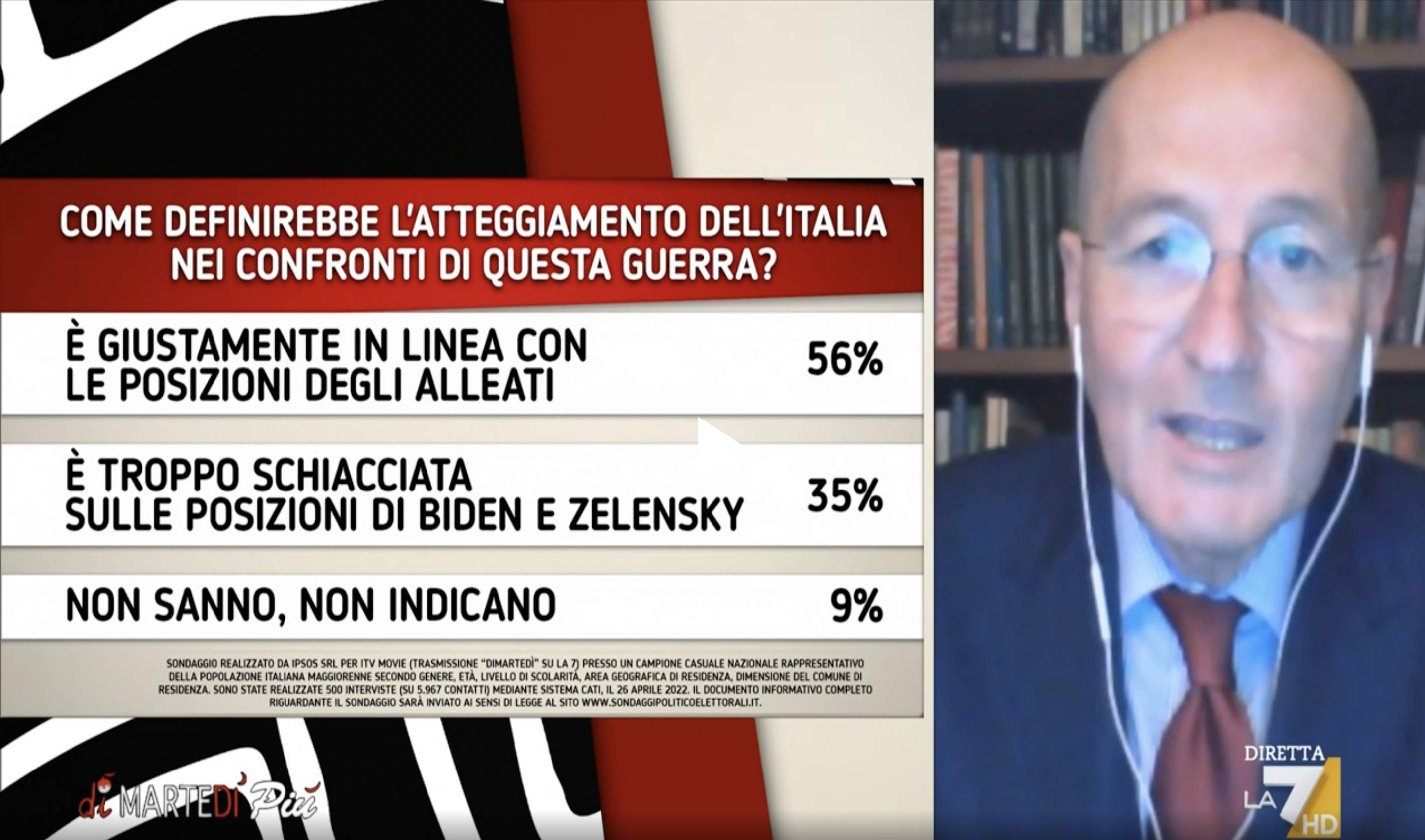 Più netto, invece, il giudizio degli intervistati in merito all’atteggiamento del governo italiani nei confronti del conflitto in Ucraina. Secondo il 56%, infatti, il nostro Paese è “giustamente in linea con le posizioni degli alleati”, mentre il 35 per cento ritiene che l’Italia sia “troppo schiacciata sulle posizioni di Biden e Zelensky”. Il 9 per cento, invece, non ha risposto al quesito.