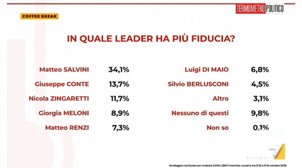 Il sondaggio di Termometro Politico realizzato nei giorni 23 e 24 ottobre e diffuso venerdì 25 nel corso del programma di La7 Coffee Break fornisce anche i dati sulla fiducia degli italiani nei confronti dei leader politici. E attribuisce al segretario della Lega un vantaggio sugli altri maggiore di quello che il Carroccio vanta sugli altri partiti.