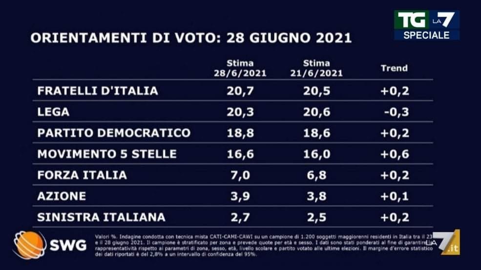Sondaggi politici elettorali oggi 29 giugno 2021
