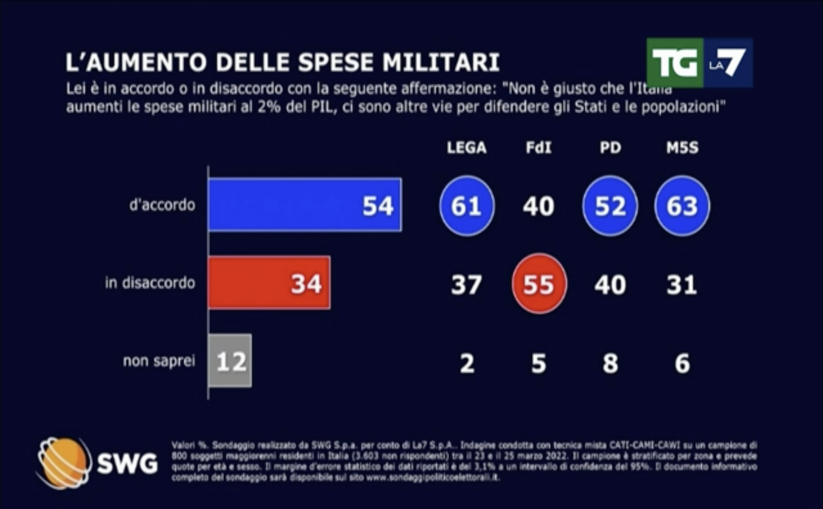 SONDAGGI POLITICI ELETTORALI OGGI – No all’aumento delle spese militari: è quanto emerge dagli ultimi sondaggi politici elettorali elaborati da Swg per il TgLa7.