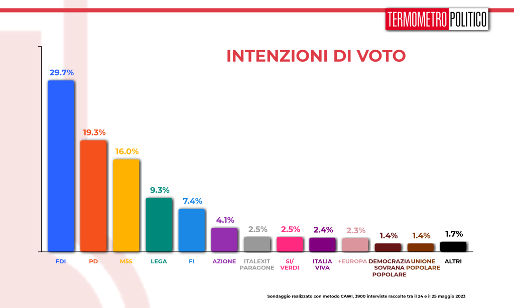 SONDAGGI POLITICI ELETTORALI – Guadagnano terreno Fratelli d’Italia e Partito democratico, separati ancora da oltre 10 punti di distacco. Lo conferma l’ultimo sondaggio realizzato da Termometro Politico tra il 23 e il 25 maggio, che vede il partito guidato da Giorgia Meloni al 29,7 percento, 0,3 punti in più rispetto alla settimana precedente. Sale anche il Pd, stimato al 19,3 percento dopo una crescita di 0,2 punti, mentre il Movimento 5 stelle si conferma di nuovo al 16 percento.
