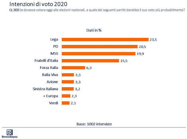 Un autentico tonfo, che fa felici il Partito Democratico e il Movimento Cinque Stelle. Meloni si confermerebbe stabilmente in doppia cifra, riducendo il proprio gap dalla Lega. Proprio i partiti che sostengono l’attuale governo guidato da Giuseppe Conte avrebbero così superato quelli della coalizione di centrodestra. Lega, Forza Italia e FdI si attesterebbero al 45,3%, mentre la somma dei partiti di governo è di 46,9%. Un sorpasso, come dicevamo, inimmaginabile fino a pochi mesi fa.