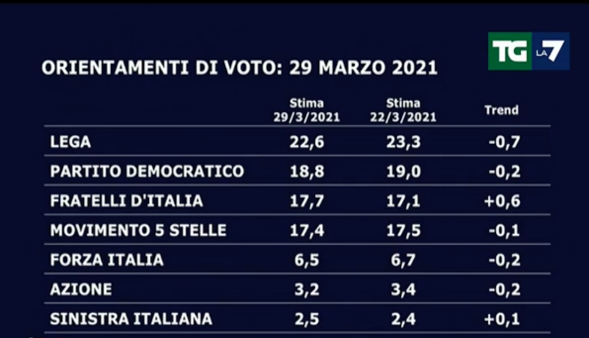 Andando con ordine, infatti, rispetto all’ultima rilevazione dell’istituto – trasmessa dal Tg il 22 marzo scorso – la Lega ha perso 0,7 punti, restando però il primo partito al 22,6 per cento. Il Pd, tornato al secondo posto dopo l’elezione del nuovo segretario, non ha più beneficiato del cosiddetto “effetto Letta”, perdendo lo 0,2 e fermandosi al 18,8 per cento di preferenze tra il campione di persone intervistate.