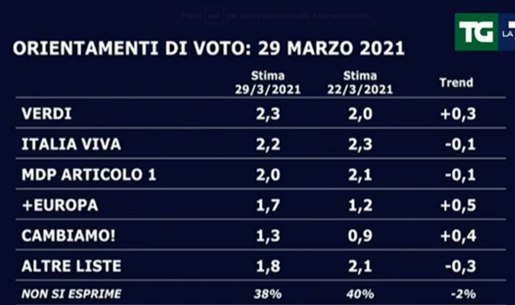 Secondo gli ultimi sondaggi politici elettorali, inoltre, dopo Forza Italia – al 6,5 per cento – e Azione di Carlo Calenda, ferma al 3,2 per cento, si fa largo Sinistra Italiana, che in una settimana ha guadagnato lo 0,1 sorpassando Italia Viva di Matteo Renzi, in calo a sua volta dello 0,1. A superare il partito dell’ex premier anche i Verdi, al 2,3 per cento: 3 punti in più rispetto al 23 marzo e uno in più di Iv. Agli ultimi posti Articolo 1, + Europa e il partito Cambiamo fondato da Giovanni Toti. Resta alto il tasso di possibile astensione: se si votasse adesso, infatti, tra il campione intervistato da Swg il 38 per cento di persone non si recherebbe alle urne.
