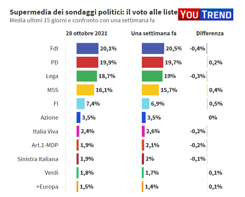Torna a crescere anche Forza Italia (+0,5%), per un totale del 7,4% delle preferenze del campione. Sopra la soglia di sbarramento Azione di Carlo Calenda, con il 3,5% dei consensi. Perde lo 0,2% Italia Viva di Matteo Renzi, che non va oltre il 2,4%. Nonostante la sonora sconfitta alle recenti amministrative, secondo la Supermedia, il centrodestra rimane la prima coalizione del Paese.