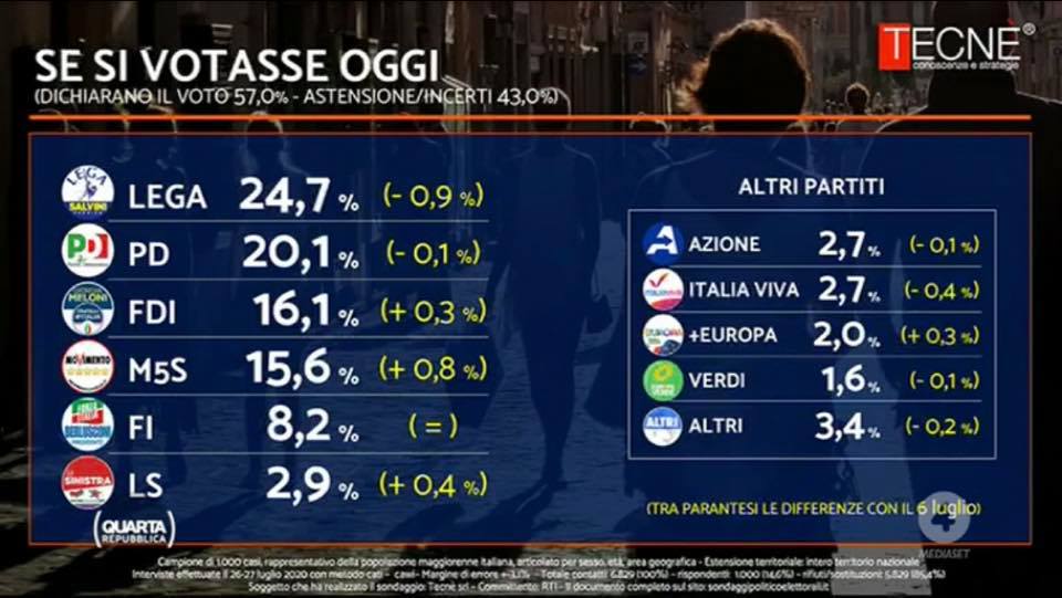 La Lega viene data al 24% (alle elezioni europee del 2019 aveva preso 10 punti in più), mentre il Pd è al 20,1%. Quanto agli altri partiti, Forza Italia è stimata all’8,2%, La Sinistra al 2,9%, Azione di Carlo Calenda al 2,7%, al pari di Italia Viva di Matteo Renzi.