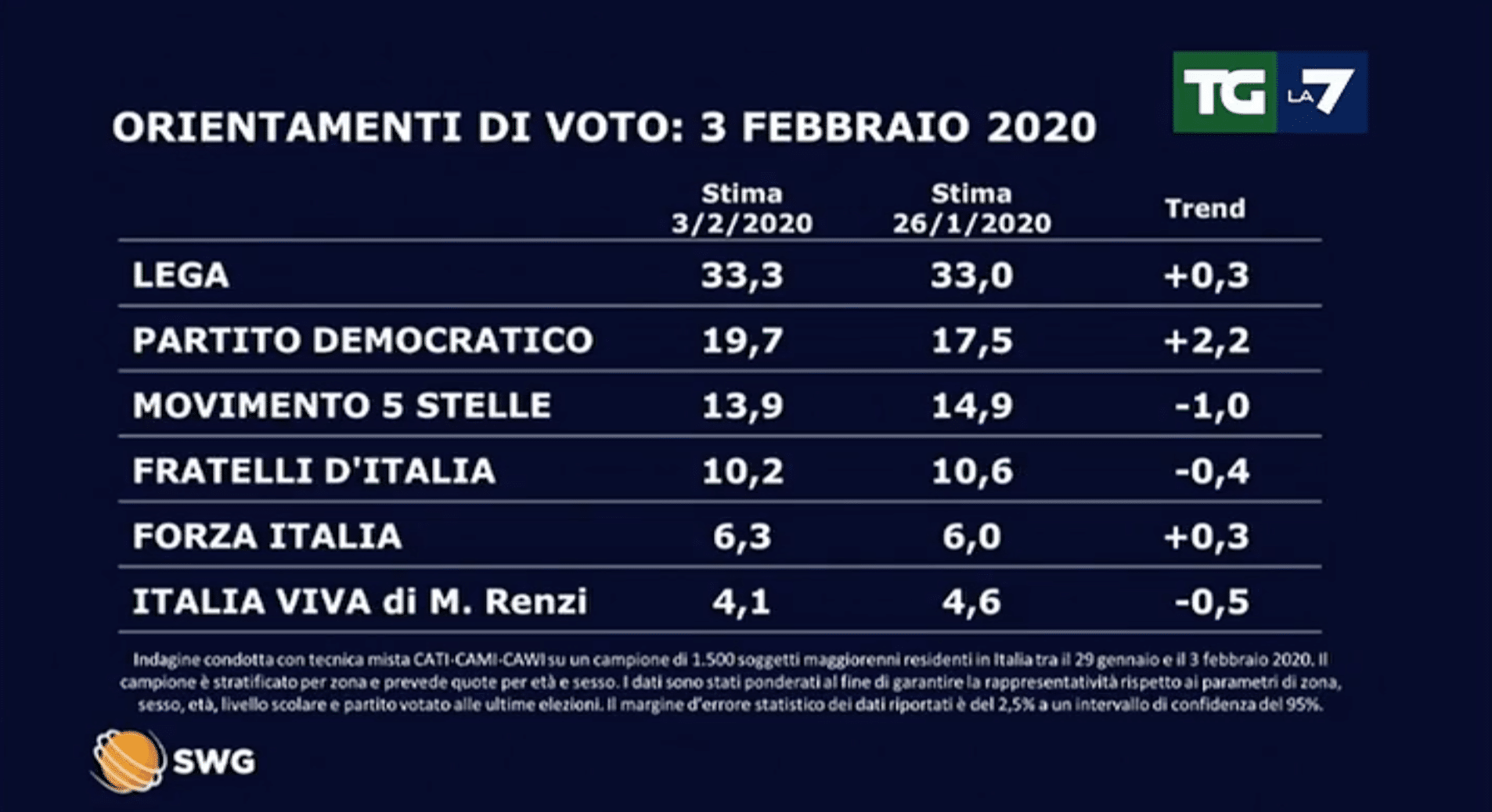 Secondo il consueto sondaggio di Swg, la Lega guadagna in una settimana uno 0,3 per cento, portandosi al 33,3 per cento. Come detto, però, è il Pd a guadagnare più di tutti. Il partito guidato da Nicola Zingaretti, infatti, passa dal 17,5 per cento dello scorso 26 gennaio al 19,7 per cento registrato in questa settimana.