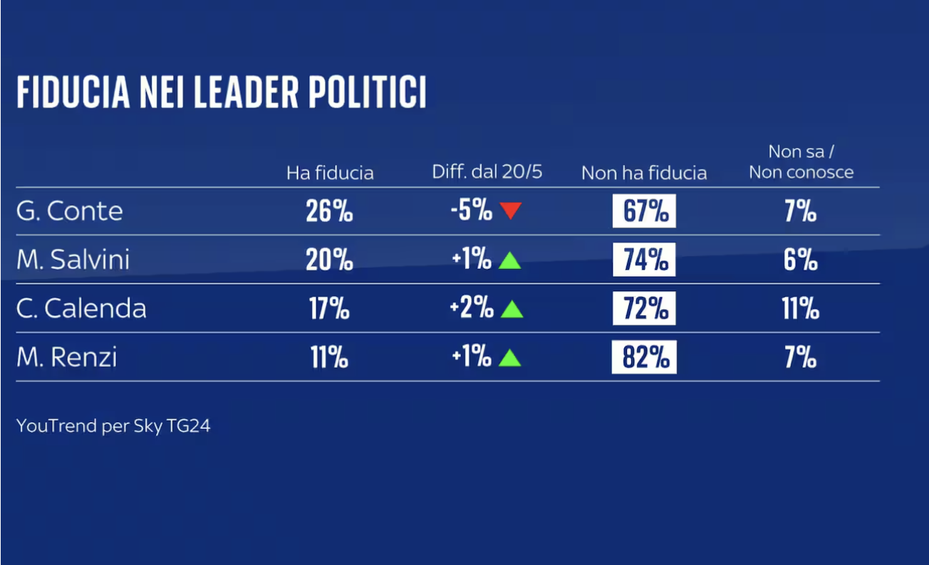 La leader del Pd Elly Schlein ottiene il 28% della fiducia, registrando il 62 per cento dei contrari, seguita da Giuseppe Conte e Matteo Salvini, rispettivamente con il 26 e il 2o per cento.