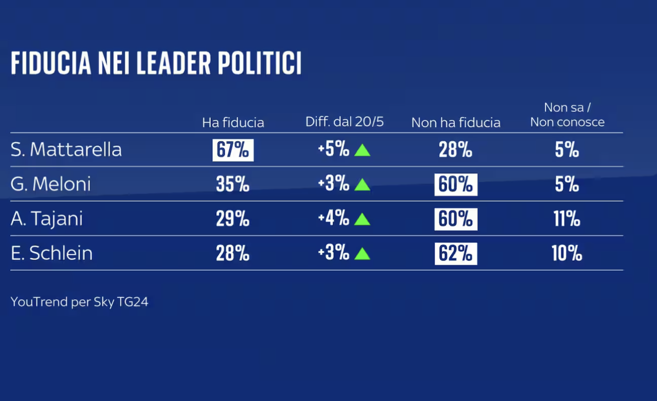 In aumento anche la fiducia nei confronti della premier Giorgia Meloni, al secondo posto con il 35% delle preferenze, seguita dal leader di Forza Italia Antonio Tajani che si piazza al 29%. Entrambi i leader, però, non hanno la fiducia del 60 per cento degli intervistati.