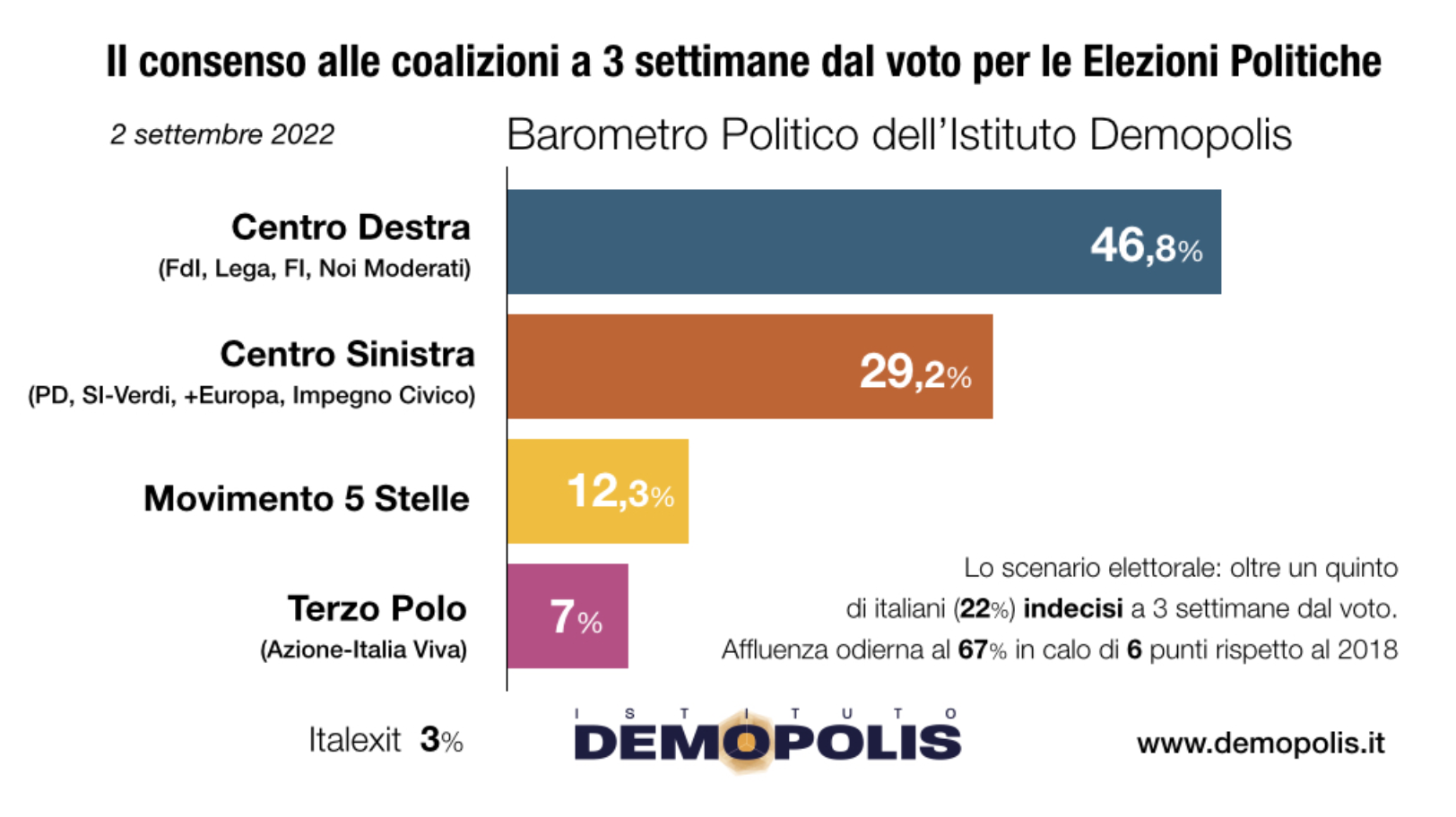 Per quanto riguarda le coalizioni, il sondaggio fotografa una situazione che appare già nettamente delineata in vista delle elezioni politiche del 25 settembre.