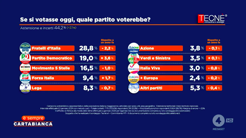 SONDAGGI POLITICI ELETTORALI – Fdi perde oltre 2 punti in un anno, boom del Pd, cresce Forza Italia: è quanto emerge dagli ultimi sondaggi politici elettorali elaborati da Tecné per il programma di Rete 4 È sempre Cartabianca.