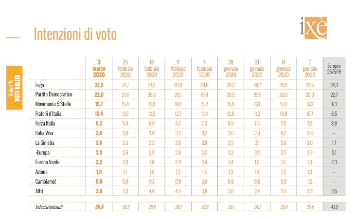 Debacle per Matteo Renzi e la sua Italia Viva. Le polemiche con il premier Conte, offuscate dal Coronavirus, non sembrano aver giovato all’ex presidente del Consiglio e segretario del Pd. Italia Viva, infatti, scende sotto la soglia del 3 per cento, portandosi al 2,8 per cento, la stessa percentuale che ottiene La Sinistra. Tra i partiti minori, cala +Europa, che dal 2,6 scende al 2,3 per cento, mentre Cambiamo! sale dallo 0,6 allo 0,9 per cento. Il “partito degli astenuti”, invece, si assesta, secondo i dati Ixè, al 38,5 per cento.