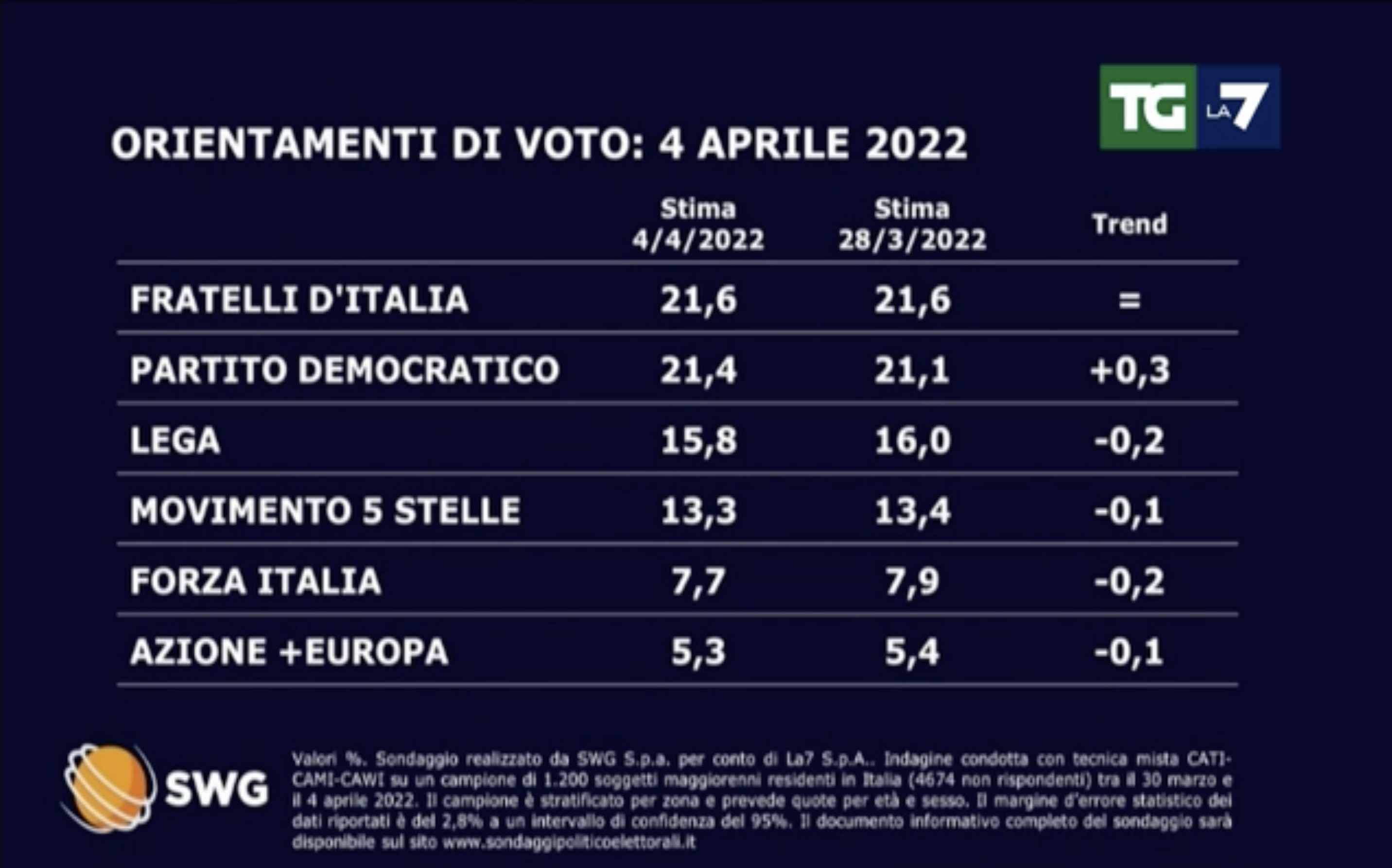 Secondo la rilevazione, Fratelli d’Italia è stabile al 21,6%, mentre il Partito Democratico, in crescita dello 0,3 per cento rispetto al sondaggio precedente realizzato sette giorni prima, insegue al 21,4 per cento.