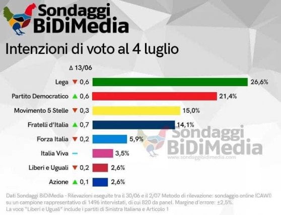 Il sondaggio in questione è quello di BiDiMedia sulle intenzioni di voto al 4 luglio, che vede la Lega primo partito con il 26,6 per cento e il Pd subito dietro con il 21,4 per cento. Seguono M5s con il 15 per cento e Fratelli d’Italia con il 14,1 per cento. Stabile Italia Viva di Matteo Renzi al 3,5 per cento, scende Leu al 2,6 per cento (-0,2 per cento), mentre Azione di Carlo Calenda registra un lieve incremento dello 0,1 per cento raggiungendo il 2,6 per cento.