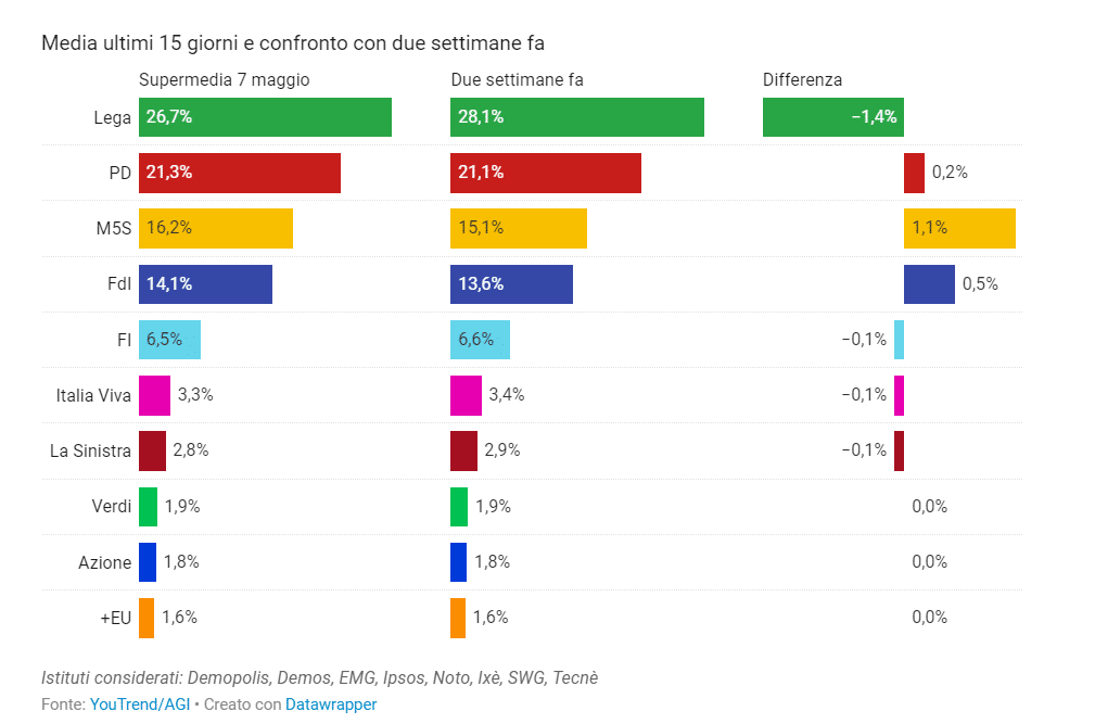 Secondo la Supermedia AGI/YouTrend di questa settimana, la Lega perde l’1,4 per cento e da questo sembra trarre vantaggio il Movimento 5 Stelle, che guadagna +1,1 per cento. Continua la sua crescita Fratelli d’Italia, che guadagna +0,5 per cento. Di conseguenza, l’area di governo accorcia di due punti la sua distanza dall’opposizione di centrodestra, che arriva a meno di 5 punti percentuali.