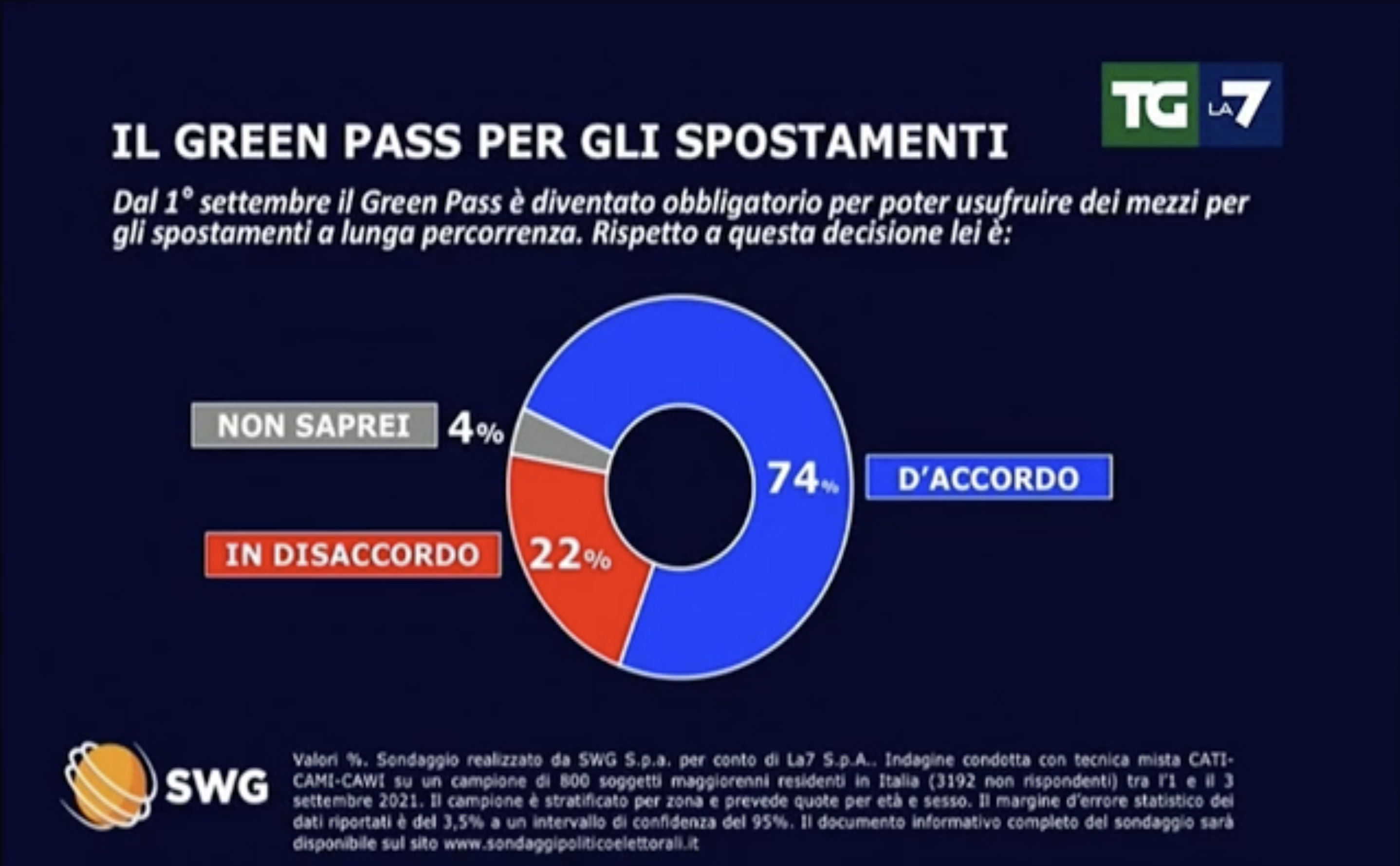 Secondo la rilevazione, infatti, il 74% degli intervistati si dice d’accordo con l’utilizzo del Green Pass per gli spostamenti a lunga percorrenza, la cui obbligatorietà è entrata in vigore dallo scorso 1 settembre, il 22 per cento è in disaccordo, mentre il 4% non ha una opinione in merito.