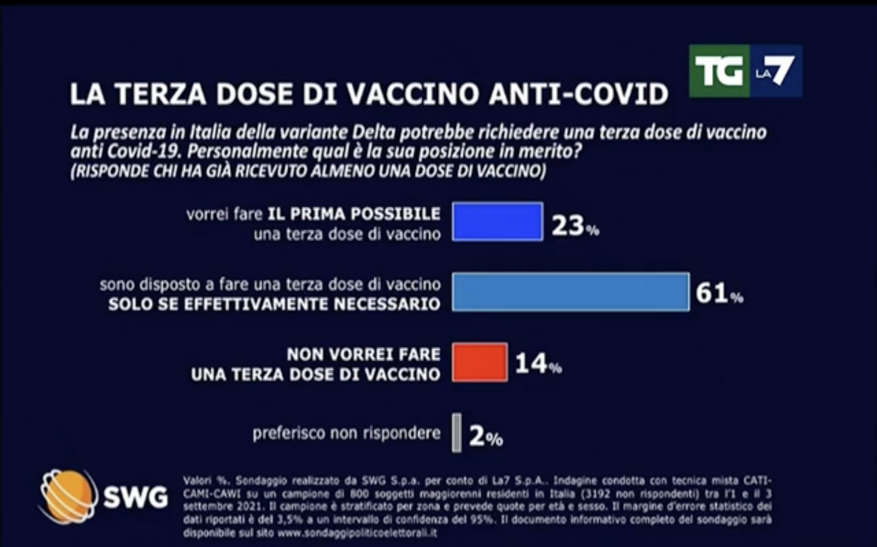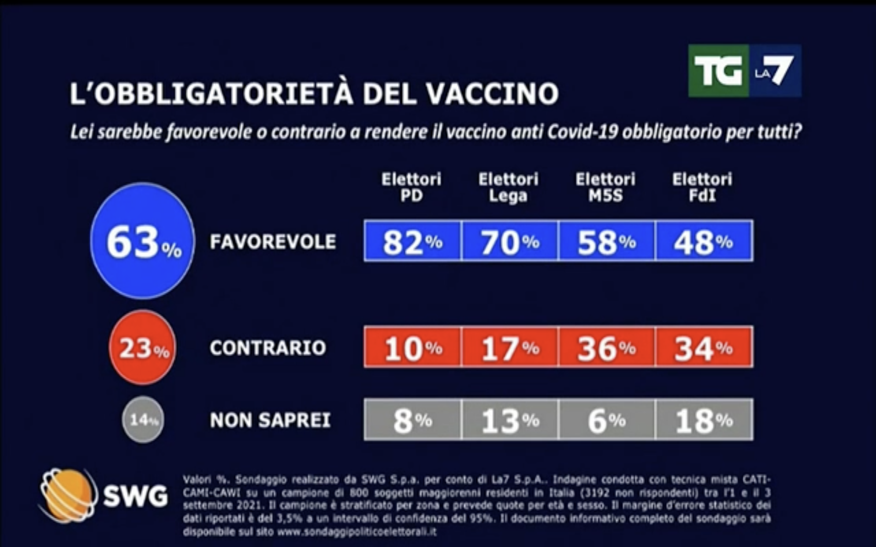 SONDAGGI POLITICI ELETTORALI OGGI – Gli italiani sono favorevoli sia al Green Pass che all’eventuale obbligatorietà del vaccino e si dicono disposti a fare la terza dose del siero anti-Covid a patto che sia “effettivamente necessario”: è quanto emerge dagli ultimi sondaggi politici elettorali elaborati da Swg per il TgLa7.