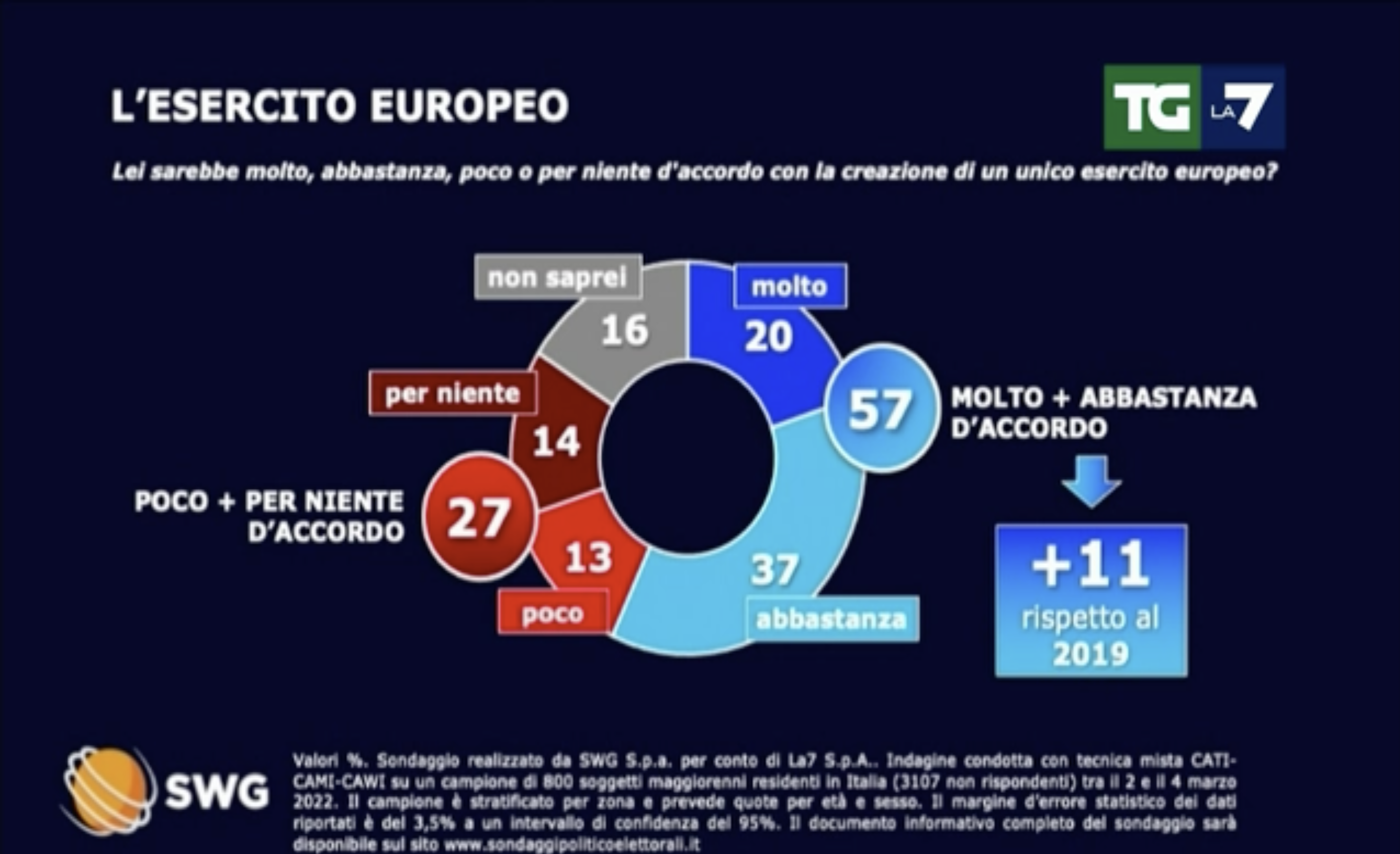 Alla domanda se “sarebbe molto, abbastanza, poco o per niente d’accordo con la creazione di un unico esercito europeo”, il 57% degli intervistati si è detto molto e abbastanza d’accordo, il 20 per cento molto e il 37 per cento abbastanza, il 27% ha risposto “poco” e “per niente”, 14% per niente, 13% poco, mentre il 16 per cento non ha espresso una opinione in merito.