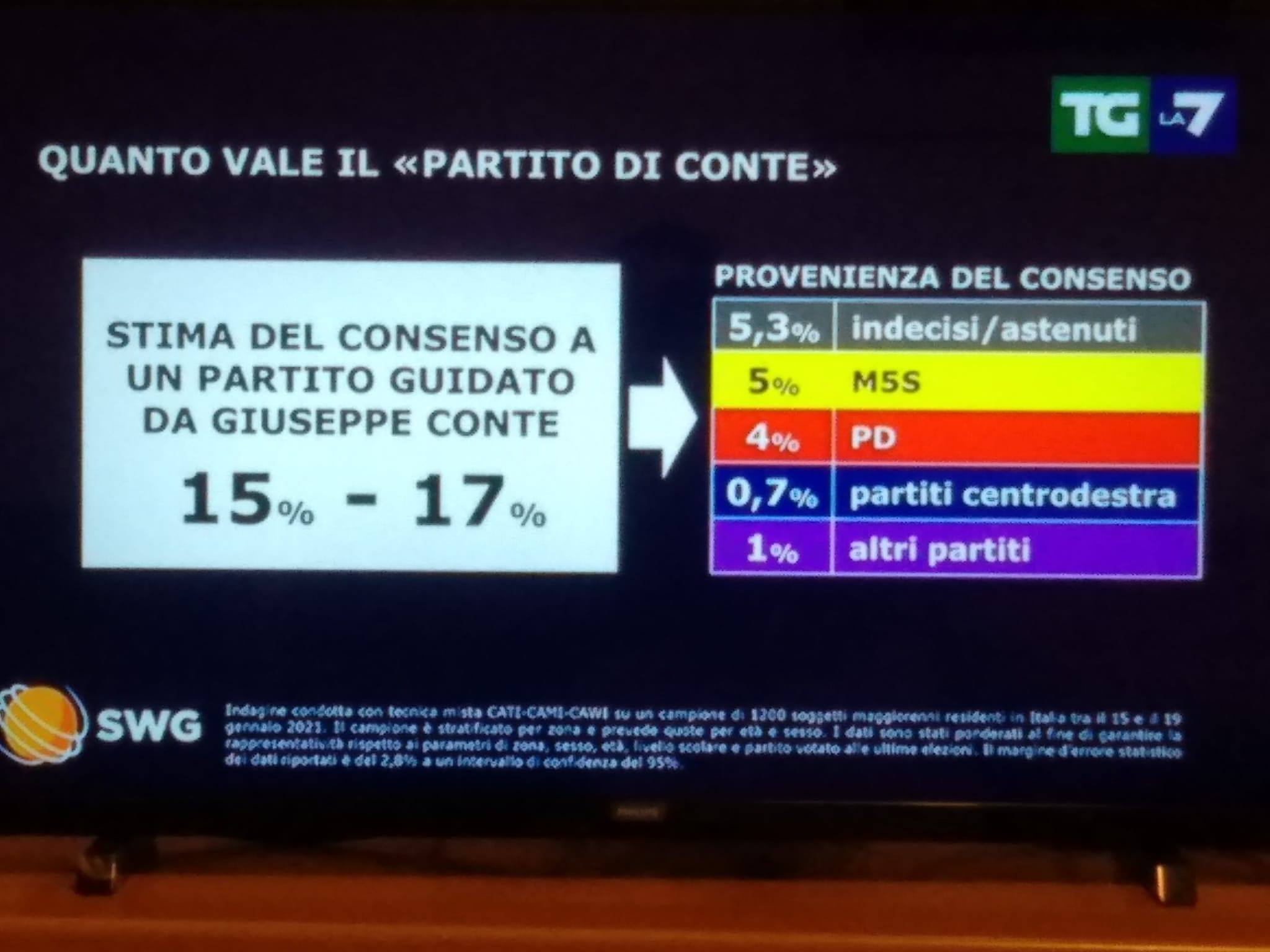 SONDAGGI POLITICI ELETTORALI – Dopo aver ottenuto la fiducia sia alla Camera che al Senato, il Governo Conte punta adesso a rinsaldare la maggioranza, grazie ai “volenterosi” da rintracciare nei prossimi giorni. Soprattutto a Palazzo Madama, infatti, i numeri per l’esecutivo sono risicati, e in un momento del genere, il Governo non può navigare a vista. Per questo prende sempre più piede l’ipotesi della nascita di una nuova formazione centrista che possa dare il suo appoggio all’esecutivo. Ma quanto vale un eventuale “partito di Conte”? A questa domanda ha provato a rispondere il sondaggio di Swg realizzato per il Tg La7 del 20 gennaio 2021.