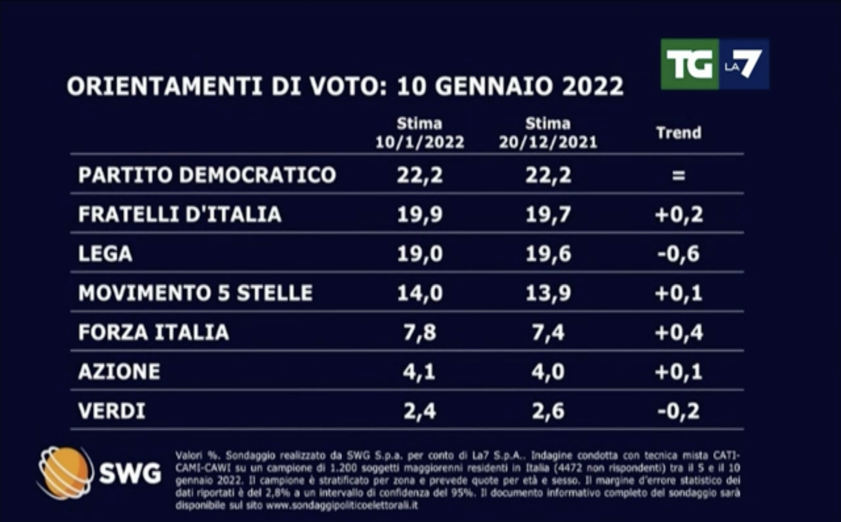 Secondo la rilevazione, la prima di Swg nel 2022, il Partito Democratico inizia l’anno così come lo aveva finito: al primo posto, seppur stabile al 22%.
