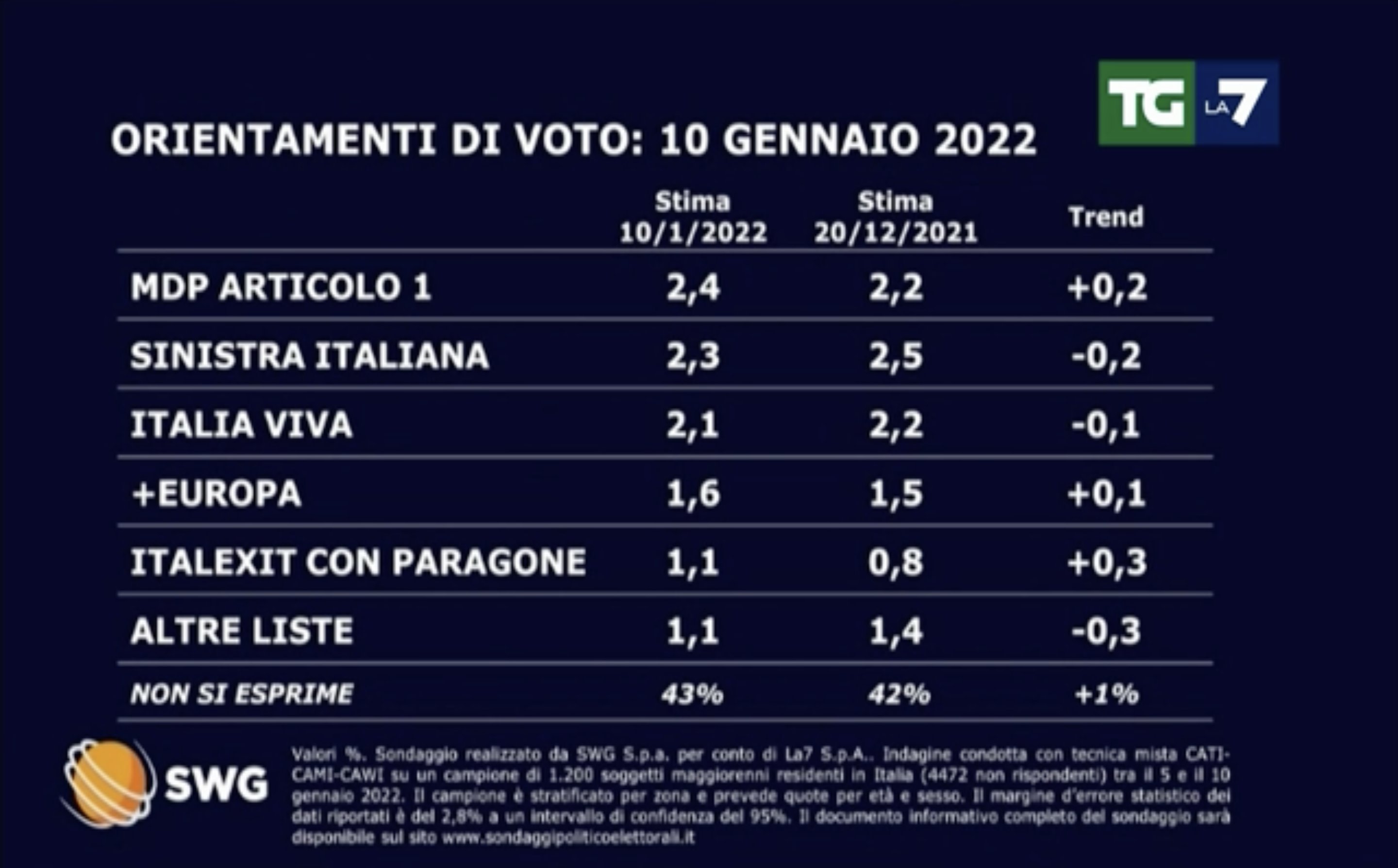 Azione passa dal 4 per cento della precedente rilevazione al 4,1%, mentre Verdi e Articolo 1 si trovano entrambi al 2,4 per cento con i primi che calano dello 0,2 per cento e i secondi che fanno il percorso inverso guadagnando lo 0,2 per cento.