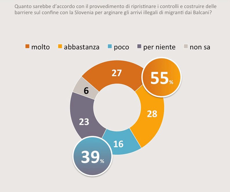 “Poco favorevole” al muro con la Slovenia il 16 per cento del campione, “per niente favorevole” il 23 per cento. La percentuale complessiva di contrari è quindi del 39 per cento.
