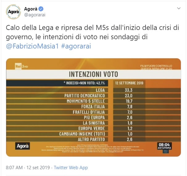 Secondo un sondaggio realizzato da Euromedia Research di Alessandra Ghisleri tra il 9 e il 10 settembre, diffuso nel corso della trasmissione di Raiuno Porta a Porta, se si votasse oggi per le Elezioni Politiche la Lega otterrebbe il 33,9 per cento delle preferenze, un livello di voti più alto di quello stimato da altri istituti, contro il 20,6 per cento del Partito Democratico e il 19,7 del Movimento 5 Stelle. Il partito di Matteo Salvini viene valutato vicino a quanto ottenuto alle Europee del 26 maggio scorso, il 34,3 per cento.