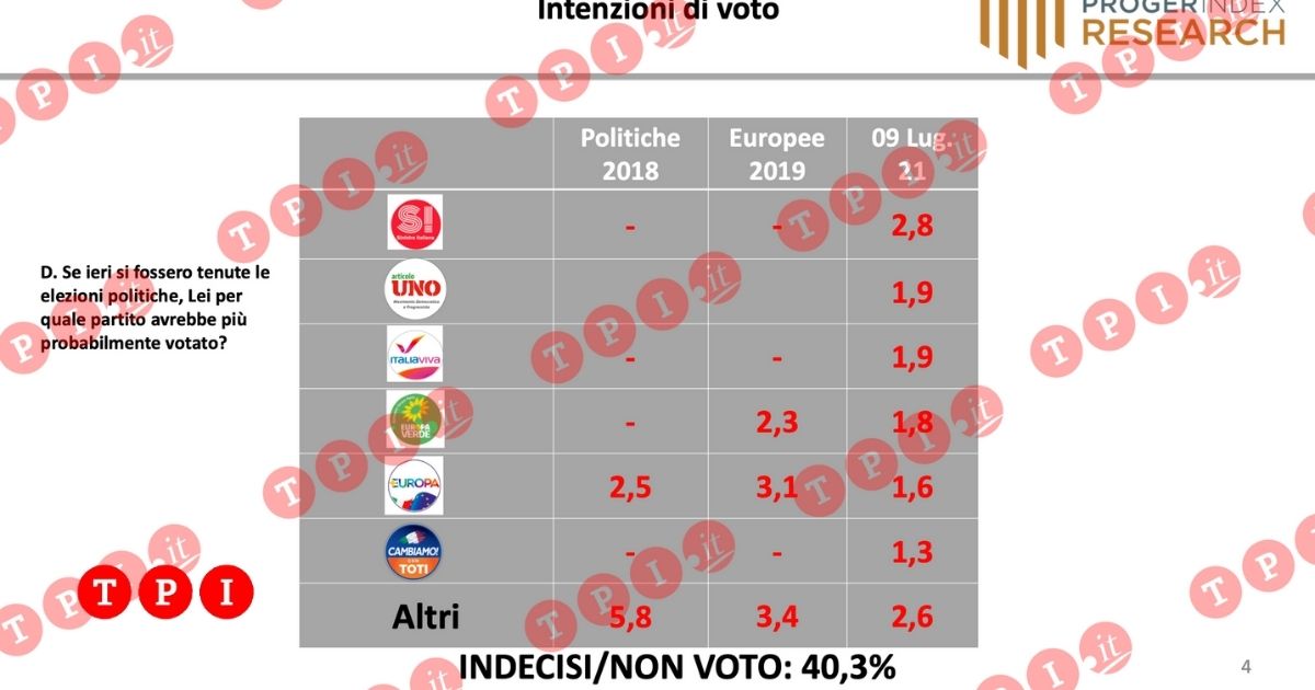 Anche a sinistra, tuttavia, il sondaggio di Index rivela un dato clamoroso: anche la sola ipotesi di una lista di Giuseppe Conte, senza che l’interessato l’abbia nemmeno annunciata, raccoglie uno zoccolo duro del 10% dei consensi. La possibile lista dell’ex premier sfiora di un soffio il 10% e svuota il M5s, lasciandolo al 7%.