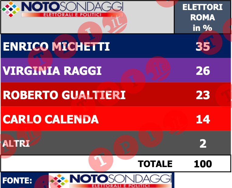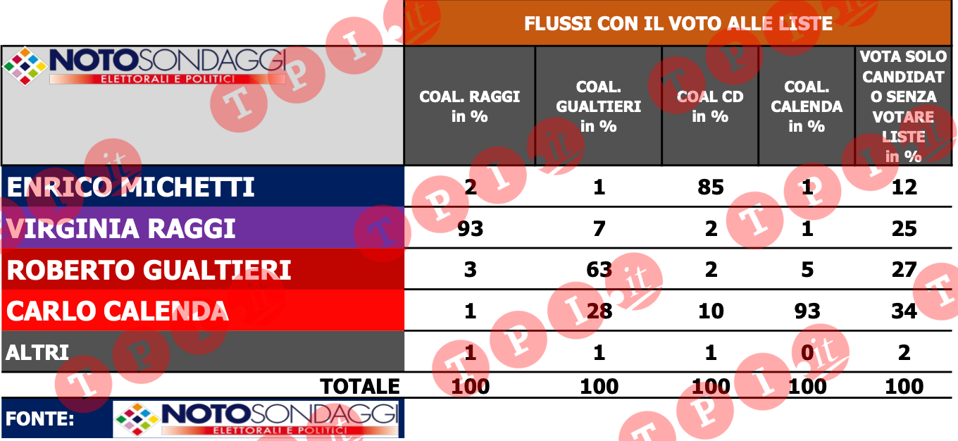 Questo non vuol dire, così come sottolineato dallo stesso Antonio Noto, le cui parole sono riportate di seguito, che senza una lista civica a supporto della Raggi, il M5S si fermerebbe necessariamente al 14 per cento, ma che, con una lista civica in appoggio, la sindaca uscente avrebbe di certo maggiori chance di approdare al ballottaggio.