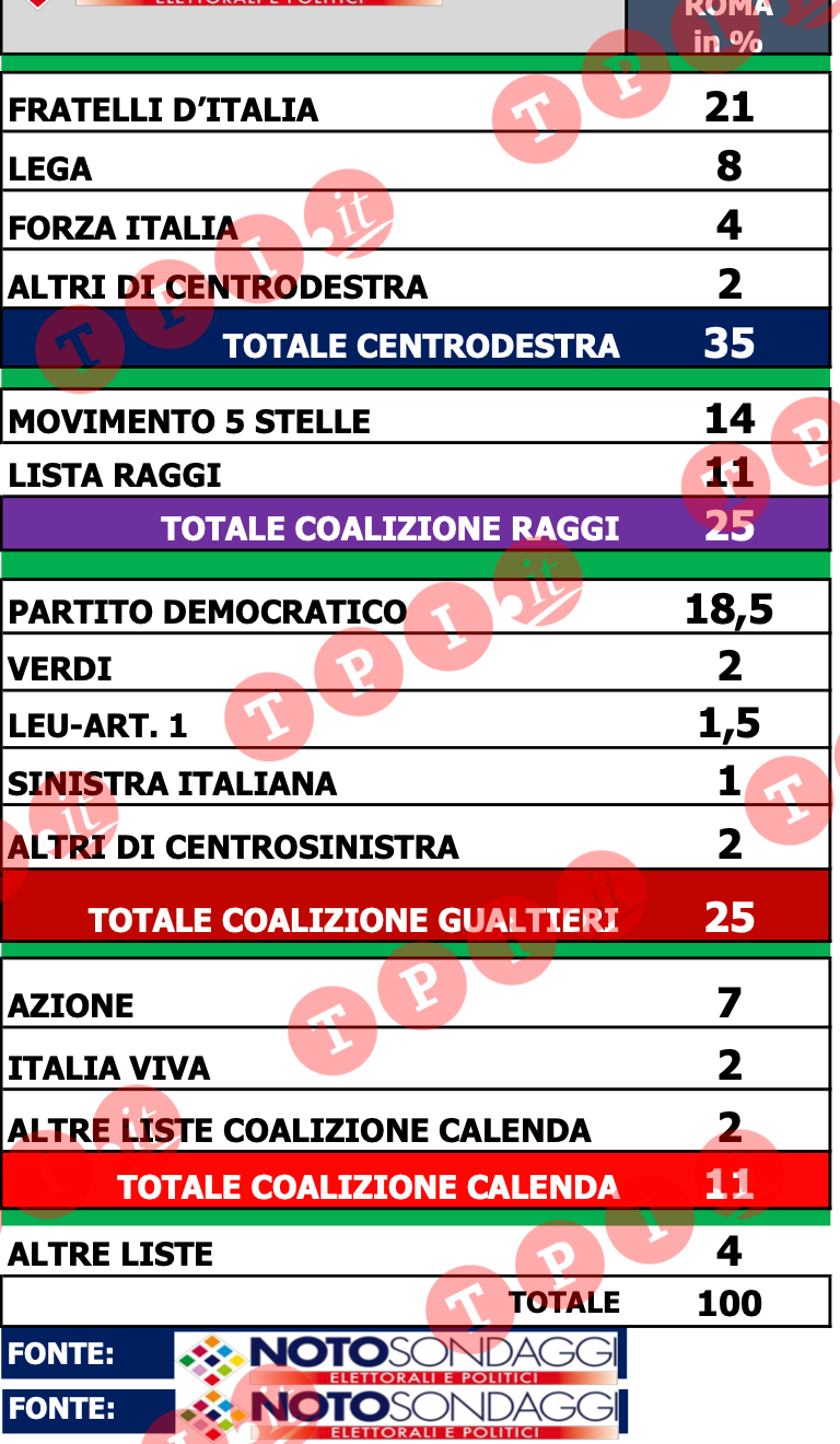 Proprio la coalizione del centrodestra risulterebbe essere la più votata con il 35% delle preferenze, così ripartite: 21% Fratelli d’Italia, con il movimento di Giorgia Meloni che diventerebbe il primo partito a Roma, 8 per cento Lega, 4 per cento Forza Italia e 2% attribuibile ad altre liste.