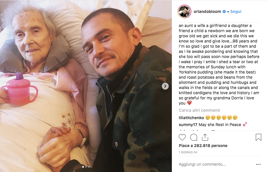 Nel post, Orlando Bloom si prepara a dire addio alla nonna Dorrie, una delle persone più importanti della sua vita, come l’attore stesso ha scritto sul social attraverso cui ha scelto di condivide il suo dolore.