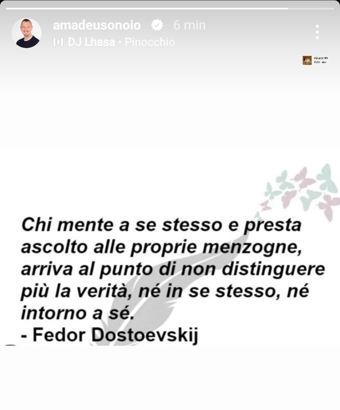 In una stories sul suo profilo Instagram, infatti, il presentatore ha citato Dostoevskij scrivendo: “Chi mente a se stesso e presta ascolto alle proprie menzogne, arriva al punto di non distinguere più la verità, né in se stesso né intorno a sé”.