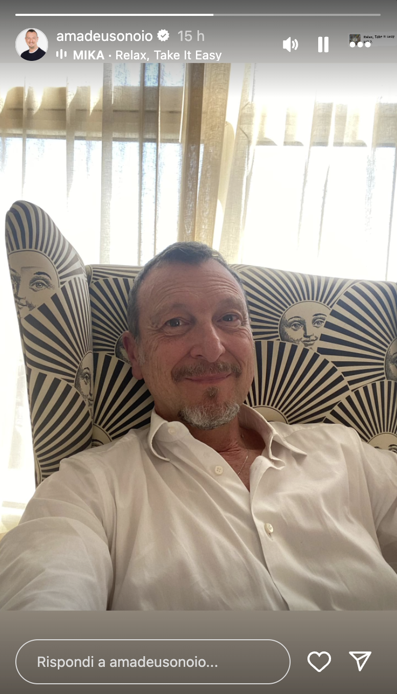 Nell’immagine, infatti, Amadeus è ritratto seduto su una poltrona con il sole che filtra dalle finestre alle sue spalle. Il conduttore appare sorridente e piuttosto rilassato.
